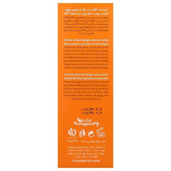 کرم ضد آفتاب رنگی وچه یک محافظت کننده قوی پوست در برابر اشعههای مضر UVA و UVB است از پیری زود رس پوست ناشی از آفتاب جلوگیری میکند. این کرم ضد آفتاب دارای بافت سبک و پوشش دهی یکنواخت است. ضد آفتاب رنگی فاقد چربی +SPF50 مناسب پوست خشک و نرمال 40میل وچه بدون چربی میباشد و پس از استفاده احساس هیچگونه سنگینی بر روی پوست باقی نمیگذارد. این محصول خشکی و التهاب پوست صورت را رفع میکند و نرم کننده و رطوبت رسان نیز میباشد.